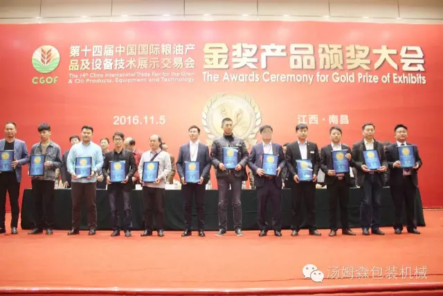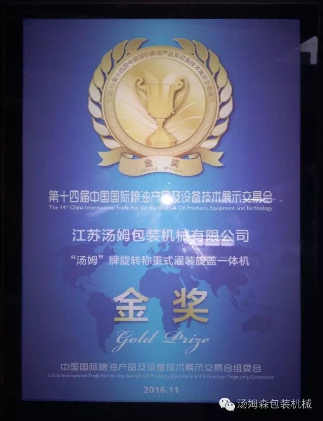 在11月6日閉幕的第十四屆中國國際糧油產(chǎn)品及設備技術(shù)展示交易會(huì )上,江蘇湯姆集團“旋轉稱(chēng)重式灌裝旋蓋一體機”喜獲金獎。