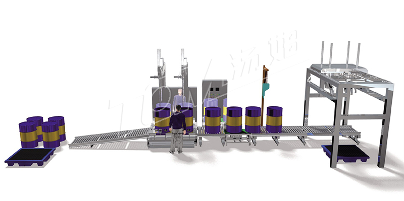 ·200KG塑料桶灌裝線(xiàn):根據用戶(hù)200KG桶的包裝而設計,人工將空桶開(kāi)好蓋子擺放在空桶輸送線(xiàn)上,自動(dòng)將桶輸送到雙頭灌裝位置,自動(dòng)對準桶口、自動(dòng)灌裝、灌裝結束通過(guò)輸送滾筒輸送到二次稱(chēng)重檢測位置,重量有偏差的停機報警,人工處理,人工旋蓋,選好蓋輸送到后端碼托盤(pán)位置,人工將托盤(pán)擺放在指定位置,每個(gè)托盤(pán)上碼4只桶,碼好后人工轉移儲存。整條線(xiàn)采用集中控制柜集中控制各個(gè)位置的機器及連鎖動(dòng)作。
