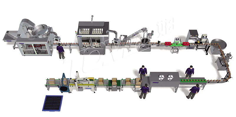·100-1000ml的圓瓶包裝線(xiàn):本流水線(xiàn)由自動(dòng)理瓶、活塞式灌裝、自動(dòng)上蓋機、旋蓋機、單瓶檢重、緩沖轉盤(pán)、自動(dòng)貼標、人工套膜、電加熱收縮、人工裝箱、自動(dòng)箱檢重(不合格的停機報警)、自動(dòng)封箱打包、人工碼垛組成。