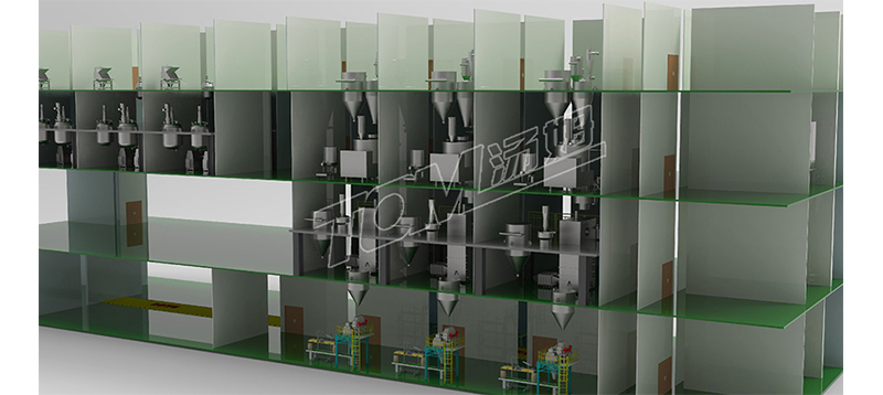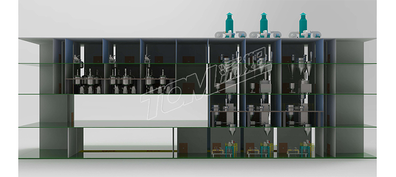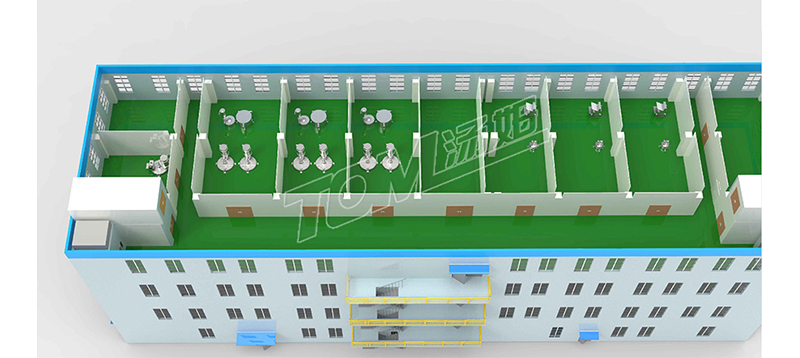 車(chē)間布局共總分為四層,四層主要是投料區和物料暫存區,三層液體制劑主要是復配區和砂磨區,固體制劑主要是粉碎區和混合區。二層液體制劑主要是包材暫存區,固體制劑主要是干燥區和成品出料區。一層是包裝線(xiàn)和成品暫存區。