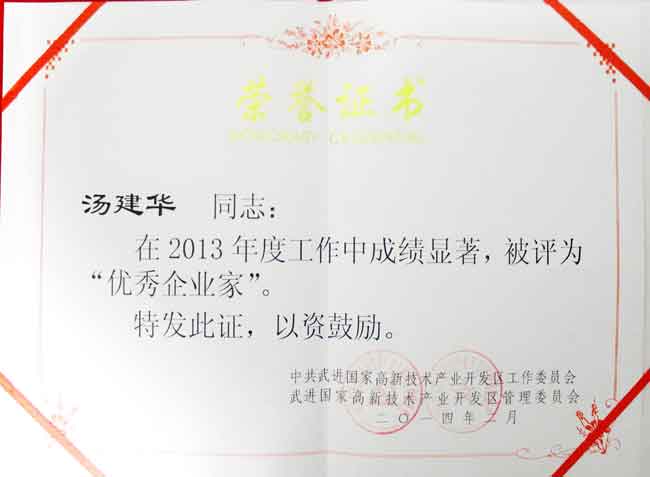湯建華同志:在2013年度工作中成績(jì)顯著(zhù),被評為“優(yōu)秀企業(yè)家”