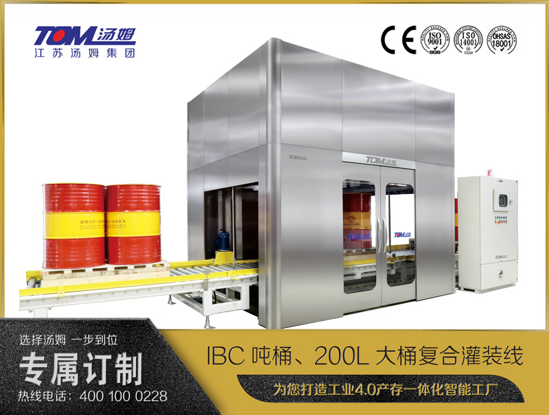 IBC噸桶、200L大桶復合灌裝線(xiàn)(自動(dòng)卸蓋、灌裝、旋蓋)
